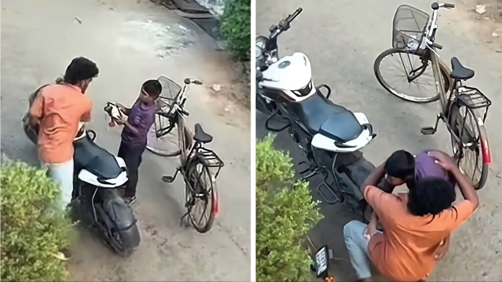 ఒక చిన్న అబ్బాయి సైకిల్ తొక్కుతూ వెళ్తూ, రోడ్డుపక్కన నిలిపి ఉన్న ఒక బైక్ను పొరపాటున బలంగా ఢీకొట్టాడు. దాంతో బైక్ నంబర్ ప్లేట్ విరిగిపోయింది.