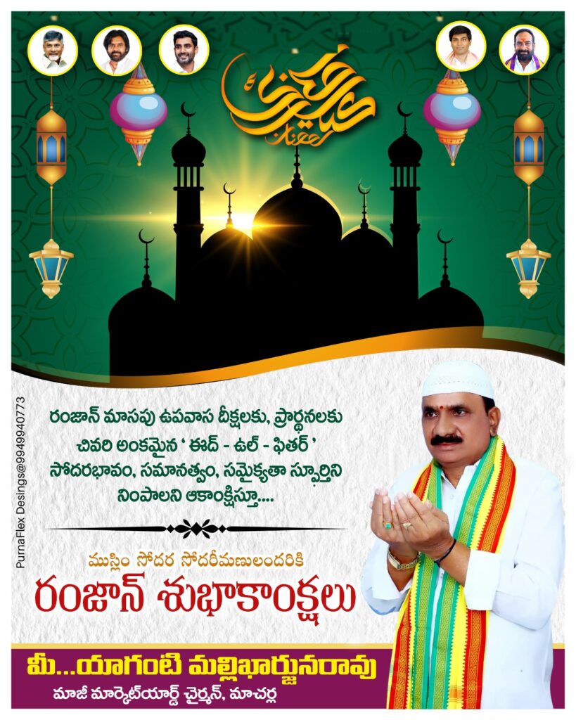 పవిత్ర రంజాన్ పండుగను పురస్కరించుకుని మాచర్ల మార్కెట్ యార్డ్ మాజీ చైర్మన్ యాగంటి మల్లికార్జున రావు ముస్లిం సోదరులకు హృదయపూర్వక రంజాన్ శుభాకాంక్షలు తెలిపారు. ఈ సందర్భంగా ఆయన మాట్లాడుతూ, నెల రోజులపాటు కఠిన నియమాలతో ఉపవాస దీక్షలు పాటిస్తూ, శాంతి, సౌభ్రాతృత్వం కోసం ప్రార్థనలు చేసిన ముస్లిం సోదరుల ఆత్మీయత, భక్తి భావం సమాజానికి ఆదర్శమని పేర్కొన్నారు.