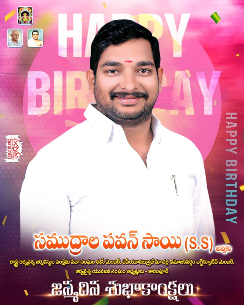 పల్నాడు జిల్లా మాచర్ల నియోజకవర్గానికి చెందిన రాష్ట్ర ఆర్యవైశ్య జర్నలిస్టుల సంక్షేమ సేవా సంఘం ఈసీ మెంబర్, ఏపీయూడబ్ల్యూజే మాచర్ల నియోజకవర్గ ఎగ్జిక్యూటివ్ మెంబర్, ఆర్యవైశ్య యువజన సంఘం అధ్యక్షులు కారంపూడి సముద్రాల పవన్ సాయి జన్మదినోత్సవాన్ని పురస్కరించుకొని ఆయనకు ఆర్యవైశ్య సంఘం సభ్యులు, జర్నలిస్టులు హృదయపూర్వక శుభాకాంక్షలు తెలియజేశారు.