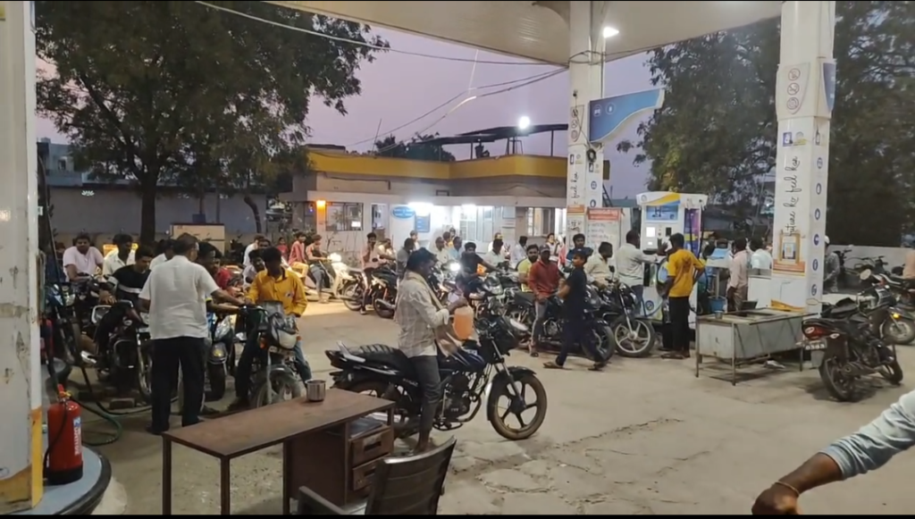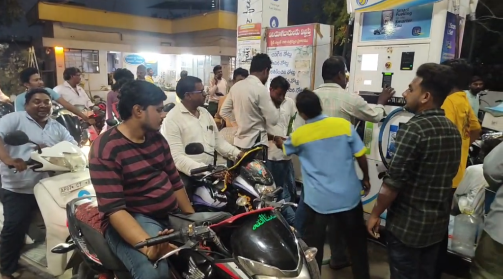 దీనితో వాహనాల్లో మాత్రమే కాకుండా, బాటిళ్లు, క్యాన్లలో కూడా పెట్రోల్ నింపుకునేందుకు జనాలు ఎగబడుతున్నారు. బంకుల వద్ద వాహనాల క్యూలు పొడవుగా సాగుతూ రద్దీ తీవ్రంగా మారింది.