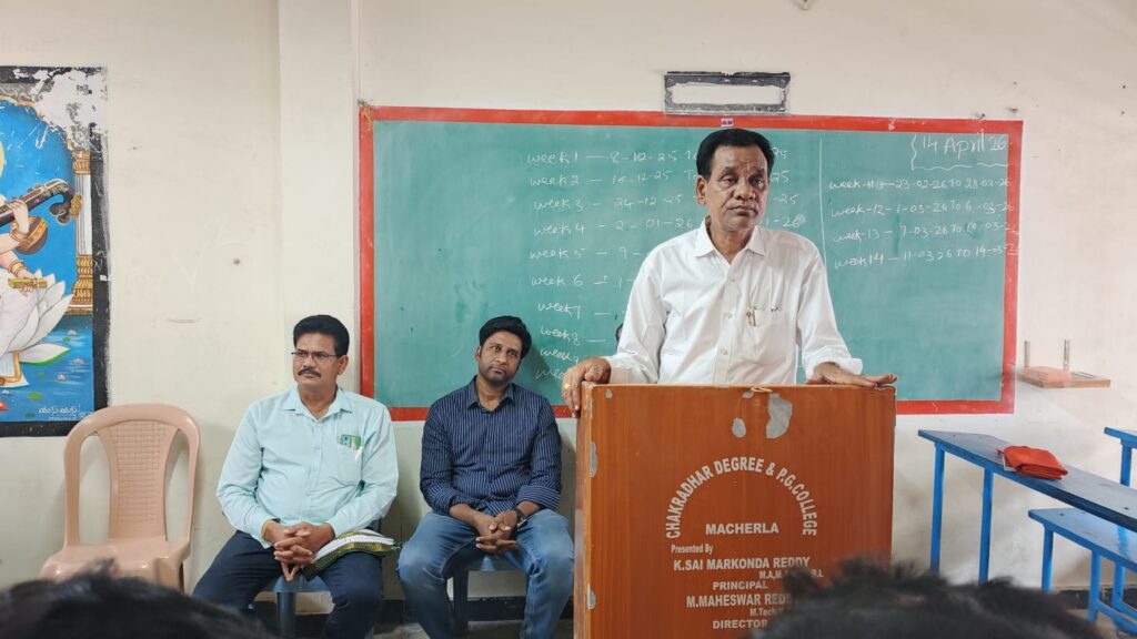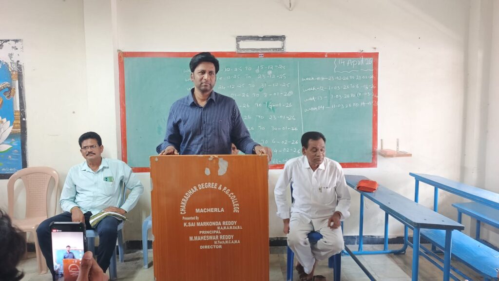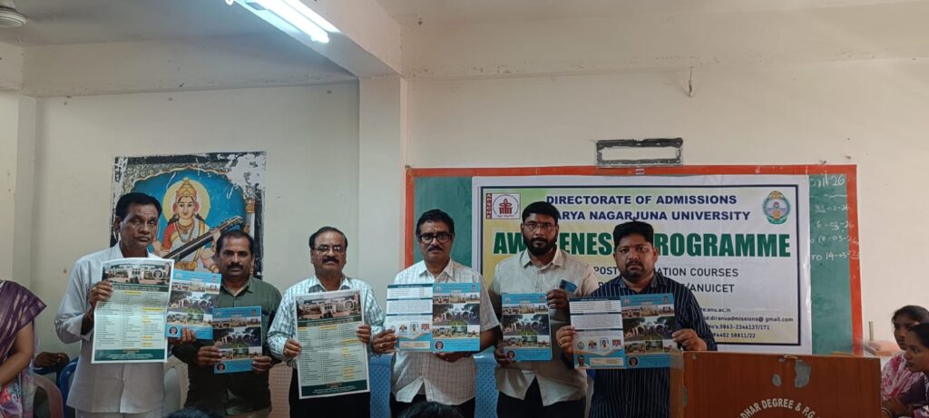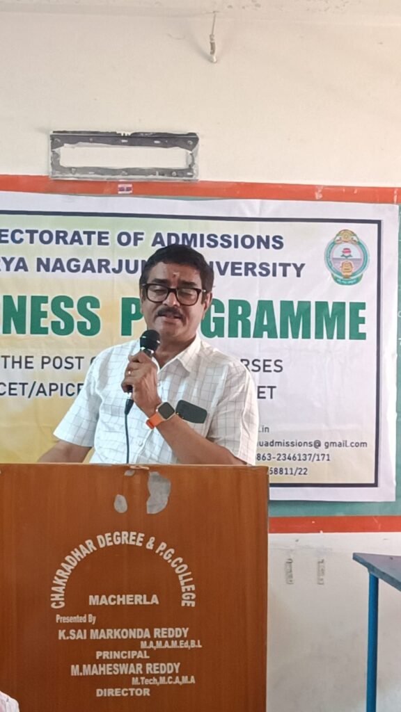 చక్రధర్ డిగ్రీ కళాశాలలో డిగ్రీ ఫైనల్ ఇయర్ విద్యార్థుల వీడ్కోలు సభను పురస్కరించుకుని ఆచార్య నాగార్జున యూనివర్సిటీ (ఏఎన్యూ) ఆధ్వర్యంలో పీజీ అడ్మిషన్స్పై అవగాహన కార్యక్రమం నిర్వహించారు. ఈ కార్యక్రమంలో ముఖ్య అతిథిగా పాల్గొన్న ప్రొఫెసర్ ఆర్వీఎస్ఎస్ఎన్ రవికుమార్ (OSD, ఏఎన్యూ) మాట్లాడుతూ, డిగ్రీ పూర్తి చేసిన విద్యార్థులు యూనివర్సిటీలో చదివే అవకాశాన్ని సద్వినియోగం చేసుకోవాలని సూచించారు.